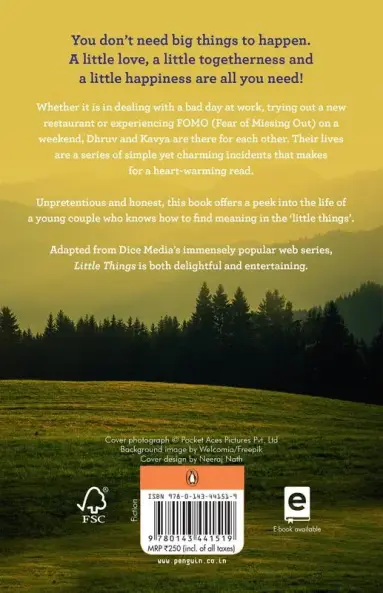 You don’t need big things to happen. A little love a little togetherness and a little happiness are all you need!Be it the effects of FOMO (Fear of Missing Out) on a weekend or trying out a new restaurant or coping with a tough day at work Dhruv and Kaveri are there to take each other through the ups and downs of everyday life. Their lives are a series of simple yet charming incidents that make for a heart-warming read in the form of short stories.Unpretentious and honest this book offers a peek into the life of a young couple that knows how to find meaning in the ‘little things’.Adapted from Dice Media’s immensely popular web series by the same name Little Things is both delightful and entertaining.